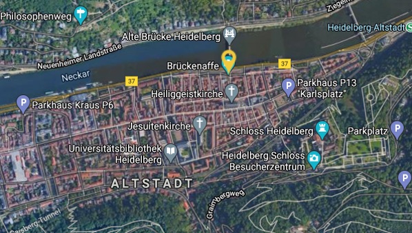 The Bridge Ape is a popular photo theme for visitors to Heidelberg. Already in the 15th century a bridge monkey is mentioned at the Old Bridge. The bronze sculpture that we find today was erected in 1979 by Professor Gernot Rumpf.